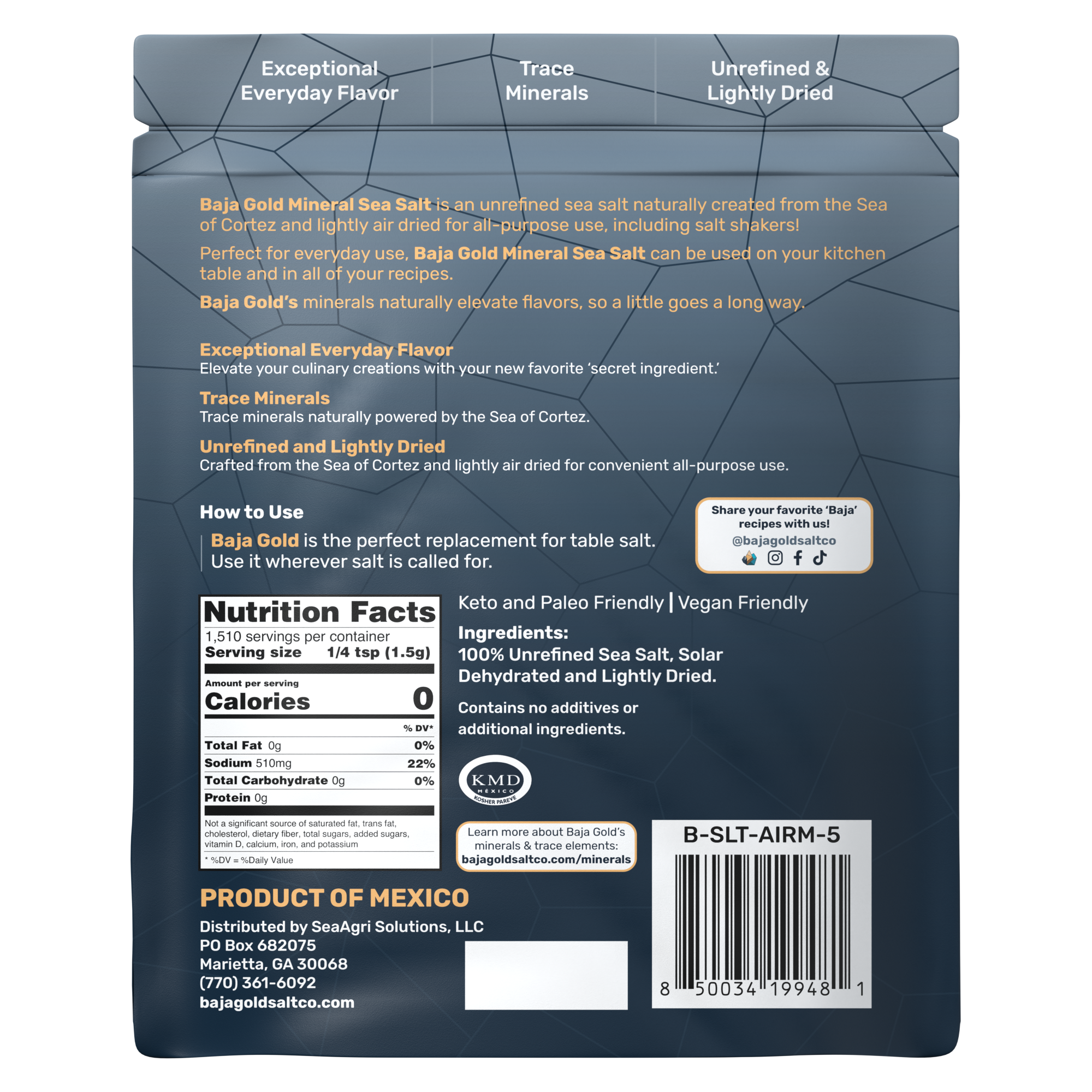 Our all-new Shakers are naturally harvested from the Sea of Cortez and lightly air-dried for everyday use. Baja Gold features a comprehensive trace mineral profile and can be used on your kitchen table and in all of your recipes. Make the switch today - your tastebuds will thank you!